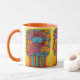 Vibrant Stylised painting of a colourful floral bouquet in a matching striped colourful vase by popular artist Lisa Lorenz on a stylish coffee mug.