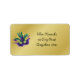 2”l x 3.75”w gold address label to match our "Celebration Extraordinaire" invitation with an image of a purple, green and gold feathered Mardi Gras mask with green sequins around the eyes. See matching invitation, envelope, favour tag and sticker. See the entire Mardi Gras Label collection in the INVITES | Stickers & Labels section.
