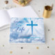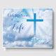 Lighted white clouds and a bright blue cross create a meaningful Guest Register for the "Celebration of Life" for a Christian loved one. Add the loved one's name and dates at the foot of the cross and on the book's spine. On the back is room for either a photo (and names) or a simple blue back that coordinates with the color of the cross. The selected fonts contrast nicely. "Celebration of Life" is currently inscribed but the wording can be easily changed.