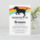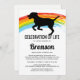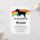 Pet funeral memorial service invitation featuring a simple white backaground, a colourful rainbow bridge, a silhouette of a dog, and a celebration of life template that is easy to personalise.
