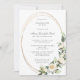 Elegant celebration of a life invitation features elegant white roses nestled in dark green foliage and greenery. The deceased person's name is written in a traditional script text surrounded by a chic oval gold frame. All of the text can be easily edited to create a personal remembrance.