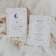 A celestial moon and star themed wedding invitation with all of the details on the back included, too. Customise the colour of the star pattern, background, arch fill and moon element!