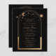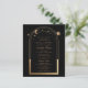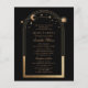 Celestial Black Gold Bilingual Spanish Quinceañera Invitations features an elegant gold sun, moon and stars with a golden frame on a black background. Inside is your custom Quinceañera invitation information in English. On the reverse is the invitation in Spanish. Personalise by editing the text in the text boxes. Designed for you by Evco Studio www.zazzle.com/store/evcostudio
