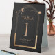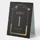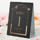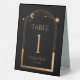 Celestial Black Gold Sun Moon Astronomy Wedding Table NumbersTable Tent Sign features gold sun, moon and stars with a golden frame on a black background. Inside is your custom table number information. Easy DIY table numbers for your wedding or event. Designed for you by Evco Studio www.zazzle.com/store/evcostudio