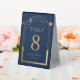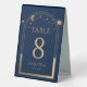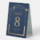 Celestial Rainbow Navy Blue Sun Moon Stars Elegant Wedding Table Numbers Table Tent Sign features a rainbow colored sun, moon and stars frame on a dark navy blue background. Inside is your custom table number information. Designed for you by Evco Studio www.zazzle.com/store/evcostudio