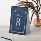 Celestial Blue Silver Sun Moon Stars Wedding Table Numbers Table Tent Sign features a silver sun, moon and stars frame on a blue background. Inside is your custom table number information. Designed for you by Evco Studio www.zazzle.com/store/evcostudio