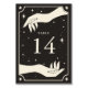 This boho table number features a tarot card style design with a celestial illustration of mystical hands and stars. On the front there is space for your table number and on the back there is space for a small message of thanks and personalisation or alternatively some information about the menu. This would be perfect for any boho or celestial themed event.