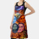 Up some magic in the kitchen with this stunning celestial chaos apron this high detailed fantasy design features for vibrant moon faces representing the elements set against a dramatic backdrop of lightning strikes, fiery dragons and a witch at her cauldron from the winking pink moon to the stern orange sun face this apron is a masterpiece of Gothic art and supernatural energy perfect for the mystical baker the Halloween host or anyone