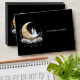 A beautiful white 3D looking white crescent moon with ornate detail on it appears to be glowing brightly against a midnight black background. It is resting on grey fluffy clouds that have vertical dangling diamond string drops hanging from it. The white silhouette of a bride and groom holding hands appears in the curve of the bottom half of the moon and white editable text templates appear to the right of this generative content graphic. This chic and stylish illustration is ideal for a moon and stars, starry night or under \ over the moon event, party or celebration