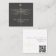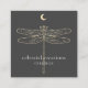 Modern square business card features gold celestial dragonfly with crescent moon illustration on dark grey background with white contemporary text on front, and grey text with customisable QR code for your website or social media on back.