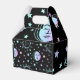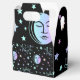 Gift box or favour box with celestial design featuring suns, moons, and stars in pastel colours on a black background.