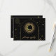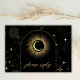 Celestial mystical personalised wedding response card featuring arch frame, galaxy milky way midnight sky with star dust, crescent moon and other astrological symbols in black and golden colours. This card is easily editable. If you need help with the customisation of this card or you need more matching products for this collection kindly message me via Zazzle.