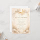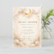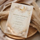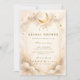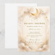 A dreamy celestial design featuring a glowing golden crescent moon set within an elegant arched frame. Soft luminous clouds, delicate stardust sparkles, and warm champagne tones create a romantic, ethereal atmosphere. The subtle marble-like background and refined gold detailing add depth and sophistication while maintaining a soft, airy glow. Perfect for a modern bride who loves celestial magic with an elevated, timeless aesthetic.