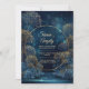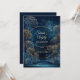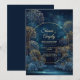 Step into an ethereal world of magic with this breathtaking midnight forest design. This invitation centers on a delicate, glowing gold circular frame set against a deep navy blue background filled with shimmering bokeh light and celestial sparkle. At the base, lush dark blue shrubs meet golden, dandelion-like allium puffballs that seem to glow with an inner light, reflecting softly off a rippling water effect. The vibe is one of pure enchanted romance, perfect for a high-end celebration held under a starlit sky. This is a wedding invitation created for formal evening ceremonies, magical forest celebrations, or celestial-themed garden events.