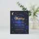 A budget wedding invitation for a celestial wedding theme, with the gold stars and crescent moon on a starry night blue background. The word Wedding and the names are written in an elegant calligraphic script. The moon and the word Wedding are faux gold foil, the rest of the text is golden. On the black, there is only the moon and star on a starry night blue background.