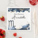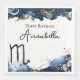 These custom birthday party invitation feature a celestial horoscope theme in shades of blue and gold. The top and bottom borders feature a celestial night sky pattern with gold accents and a crescent moon. A Scorpio horoscope symbol is printed in the bottom left beside. A sample "Happy Birthday" message is printed across the centre followed by a sample name printed in an elegant script font. You can personalise the napkins to include your own custom name or other text.