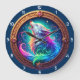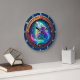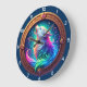 Ignite your imagination with the Celestial Howl Rainbow Wolf clock. This striking timepiece features a high-definition graphic of a majestic wolf mid-howl, its fur a vibrant spectrum of neon pinks, blues, and greens that glow against a deep midnight background. Swirling celestial energy and sparkling stardust surround the wolf, creating a sense of mystical power. The artwork is encased in a rich, copper-toned circular frame featuring a complex braided texture and set with glowing purple and blue "jeweled" accents at the cardinal points. While the design masterfully captures the luminous depth of fantasy art and dimensional woodcraft, this is a durable high-definition graphic application on a premium round clock face. It serves as a prestigious and captivating statement piece for any modern or fantasy-themed space.