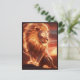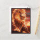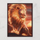 A mesmerising cosmic scene featuring a celestial lion, crafted from swirling, energetic light. The lion's eyes burn brightly with a radiant glow, while its magnificent golden mane and fur blaze with an intense, fiery brilliance. Perched on a rocky terrain, the majestic creature stands as a beacon of primal energy. The sun sets in the background, bathing the landscape in warm, rich hues of orange and pink, evoking a sense of wonder and awe.