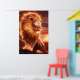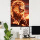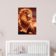 A mesmerising cosmic scene featuring a celestial lion, crafted from swirling, energetic light. The lion's eyes burn brightly with a radiant glow, while its magnificent golden mane and fur blaze with an intense, fiery brilliance. Perched on a rocky terrain, the majestic creature stands as a beacon of primal energy. The sun sets in the background, bathing the landscape in warm, rich hues of orange and pink, evoking a sense of wonder and awe.