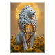 Behold a majestic, stylized white lion, crafted in an intricate, layered papercraft or sculpted style, standing proudly amidst a vibrant field of tall yellow sunflowers. Its flowing mane whirls dynamically, capturing movement and power, while piercing yellow or orange eyes convey intensity and strength. The lion’s torso, or a significant portion of its body, is dramatically cracked or split open, revealing a stunning internal cityscape nestled within—a gleaming, futuristic metropolis of towering skyscrapers, complex geometric structures, and glowing light trails, reminiscent of a planet’s core exposed through a celestial fracture. Behind the lion, a luminous orange sun or abstract celestial disk dominates the sky, gradually transitioning into a starry cosmic expanse at the upper edges, enhancing the mystical and otherworldly atmosphere. The overall esthetic masterfully blends organic, spiritual naturalism—embodied in the lion and sunflower field—with sleek, high-tech futurism showcased in the glowing city inside the lion. Highly detailed and symbolic, this scene creates a striking contrast between the warm, natural exterior and the cool, luminous interior, evoking themes of inner strength, discovery, and cosmic wonder.
