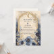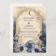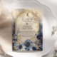 A luxurious celestial-themed wedding design featuring a midnight blue floral garden, shimmering gold accents, and a golden crescent moon framed by an ornate arch. Perfect for couples seeking a romantic, mystical, and starry-night-inspired celebration with elegant cosmic details.