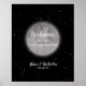 Welcome guest to your romantic and dreamy celestial wedding with this Moon and Stars wedding sign. Featuring a chic grey watercolor moon with the phrase 'Welcome to our happily ever after'. The background is sprinkled with tiny illustrated stars and below the luminesent, a full moon is the bride and grooms names along with the date of the wedding.