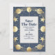 Printed on high-quality, textured cardstock, this save-the-date card has a rich, tactile feel that adds to its elegance. The back of the card features a continuation of the starry sky pattern or a simple solid colour that complements the front design, tying the entire piece together.