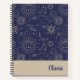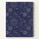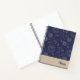 Customisable notebook features hand drawn celestial and astronomical designs including suns, planets and stars on dark navy background.