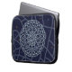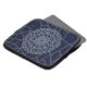 A lace-like concentric circle mandala in light blue with bright blue and gold star-like dots spangled among the layers makes for a fun, design that brings to mind a starry night sky.
