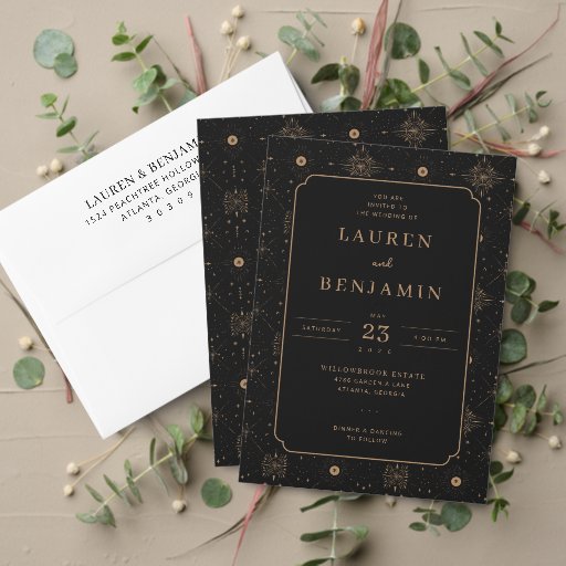 This is a celestial style image featuring an enchanting night sky filled with intricate golden stars, moons, and radiant suns against a deep black backdrop. The design exudes a sense of wonder and magic, reminiscent of gazing up at the cosmos on a clear night. It's perfect for adding a touch of mystique to any room or project, inspiring feelings of awe and tranquillity.
