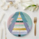 An abstract and spiritual painting dominated by a central, stylized Christmas tree. The tree is composed of horizontal bands of color in soft, muted pastels including pink, mint green, gold, and lavender. It stands in a white, textured snowy foreground adorned with sparkling gold glitter dots. The background features soft, layered fields of pink, blue-green, and purple wash, suggesting a hazy sky. Two celestial elements are prominent: a simple white moon on the left and a highly stylized, radiant gold star or sunburst on the upper right. The overall effect is sophisticated, gentle, and abstractly festive.