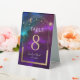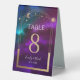 Celestial Purple Teal Gold Sun Moon Astronomy Wedding Table Numbers Paper Table Tent Sign features gold sun, moon and stars with a golden frame on colorful celestial purple, teal and blue cosmic background. Inside is your custom table number information. Designed for you by Evco Studio www.zazzle.com/store/evcostudio