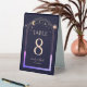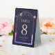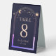 Celestial Rainbow Navy Blue Sun Moon Stars Cosmic Celestial Space Galaxy Wedding Table Numbers Table Tent Sign features a rainbow colored sun, moon and stars frame on a dark navy blue background. Inside is your custom table number information. Designed for you by Evco Studio www.zazzle.com/store/evcostudio
