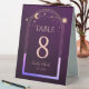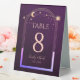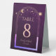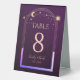 Celestial Rainbow Deep Plum Sun Moon Stars Wedding Table Numbers Table Tent Sign features a rainbow colored sun, moon and stars frame on a deep plum background. Inside is your custom table number information. Designed for you by Evco Studio www.zazzle.com/store/evcostudio