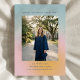 This graduation party invitation has a soft pastel gradient background in blue, pink, and peach with a large photo of the graduate front and center and all the party details in clean blue lettering above and below.
