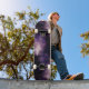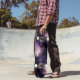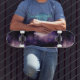 This skateboard design features a background of the galaxy / night sky in purple tones.