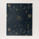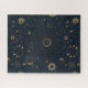 Beautiful celestial design features a zodiac wheel in shades of pale gold on a midnight blue background.