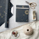 Celestial print featuring zodiac wheels in shades of pale gold on a midnight blue background.
