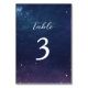 Guide your guests to their seats with elegance using this celestial wedding table number card. Featuring a dreamy navy and violet starry night sky background, this double-sided design beautifully displays the table number on both sides for easy visibility. Ideal for stargazing, cosmic, or romantic night-sky themed weddings, this table number card brings a magical touch to your reception tables. Personalise easily to coordinate with your celestial wedding decor.