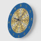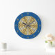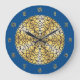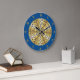 A lace-like mandala in dark blue with bright blue and gold stars and a bright sunburst gradient circle behind makes for a fun, design that brings to mind a night sky and sunny day with one image.