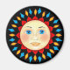 A vivid celestial sun face is radiating sunshine on this magnet. It has colours of yellow, red, blue, and orange on a black background.