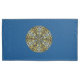 A lace-like mandala in dark blue with bright blue and gold stars and a bright sunburst gradient circle behind makes for a fun, design that brings to mind a night sky and sunny day with one image.