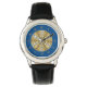 A lace-like concentric circle mandala in dark blue with bright blue and gold star-like dots spangled among the layers and a bright sunburst gradient circle behind makes for a fun design that brings to mind a starry night sky and a bright sunny day with one image. This watch is available in a variety of sizes, colours, and styles, including sizes for both kids and adults.