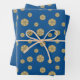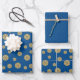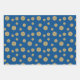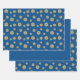 A lace-like concentric circle mandala in dark blue with bright blue and gold star-like dots spangled among the layers and a bright sunburst gradient circle behind makes for a fun design that brings to mind a starry night sky and a bright sunny day with one image. Two sheets in this set feature the mandala scattered across a rich blue background, while the third sheet features a pattern of faded polka dots on the same blue background to give you options and variety for your gift wrapping or DIY projects.
