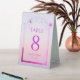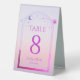 Celestial Sunset Pink Sun Moon Stars Wedding Table Numbers Table Tent Sign features a pink and purple sun, moon and stars frame on a pastel beach sunset background. Inside is your custom table number information. Designed for you by Evco Studio www.zazzle.com/store/evcostudio