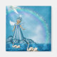 A whimsical and serene fantasy scene unfolds beneath a radiant, star-speckled rainbow that arcs gracefully across a tranquil, blue-hued sky. At the center stands an angelic figure, clad in a flowing, pale blue gown, her delicate wings unfurled as if mid-blessing. She stands upon a rocky islet surrounded by calm, glistening waters, where graceful white swans float gently, adding to the enchantment of the moment. Overhead, a luminous white bird soars through a shaft of divine light, casting an ethereal glow.