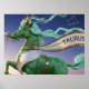 This enchanting artwork depicts a mythical horse representing the Taurus zodiac sign, beautifully crafted in vibrant green hues. The horse stands majestically, wielding a shimmering sword, with a glowing moon overhead. A flowing banner proudly displays the name "TAURUS" in elegant lettering. The lush, mystical landscape features sparkling elements that evoke a sense of magic and connection to the cosmos, making this piece a captivating tribute to the Taurus spirit.