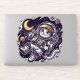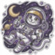 The artwork features a high-contrast palette of deep purple, crisp white, and shimmering gold. The central figure—a wide-eyed, curious kitten in a detailed space suit—is floating amidst a beautifully rendered cosmic background. You can see planets like Saturn, a glowing crescent moon, and distant stars that create a sense of depth and wonder. AmazingEG has focused on thick, bold outlines and hard-edge shading to ensure that this mascot looks sharp and impactful on any physical medium.