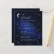 A budget wedding details card for a celestial wedding theme, with the moon and star on a starry night blue background. The title Details (that can be changed) is written in an elegant calligraphic script. The moon and the stars are faux silver foil, the text is light grey, almost white. On the black, there is only the moon and star on a starry night blue background.