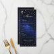 This elegant celestial wedding menu has a frame of faux silver stars and moon on a dark blue background representing the night sky. The names, the title "Menu" and the subtitles are written in an elegant calligraphic script. All text can be personalised and has a silvery grey colour similar to the stars.